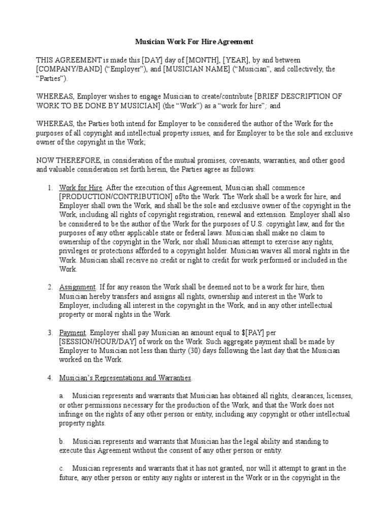 Music Work For Hire Agreement Template Work For Hire Contract Template Work Agreement