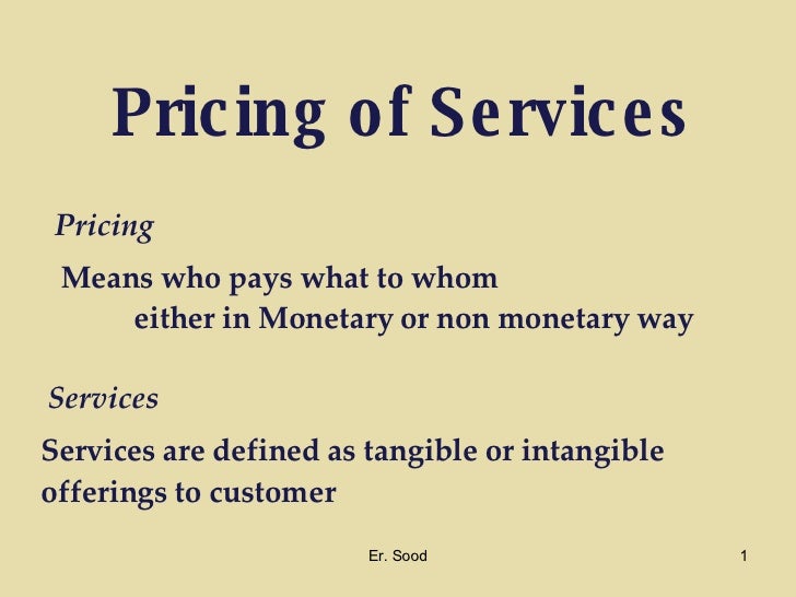 MBA 906 1 Pricing of services. If you want to know how to determine pricing for a service add together your total costs and multiply it by your desired profit margin percentage. Instead the price for which you offer your service is a reflection of the value you are providing your client.